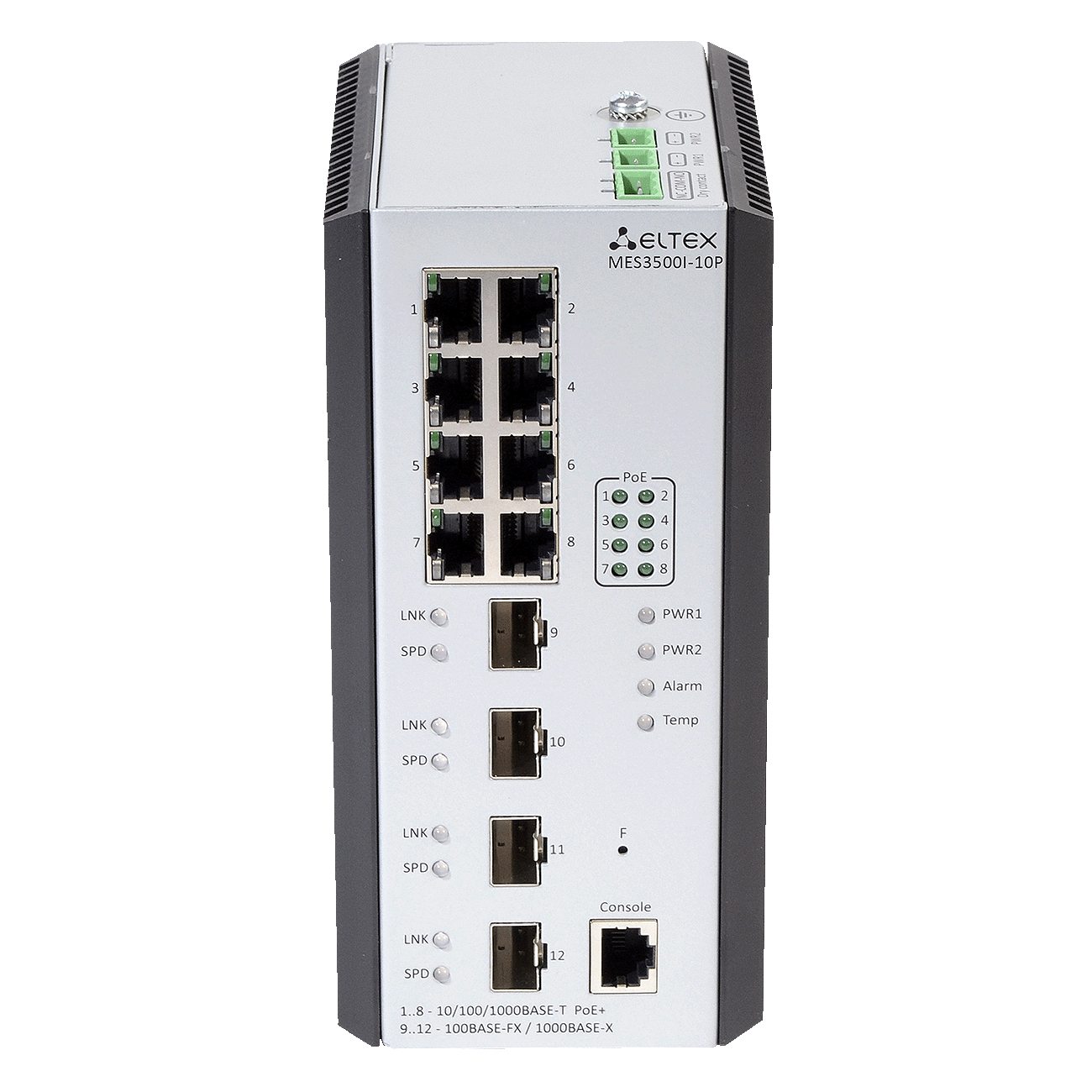 Коммутатор Eltex MES3500I-10P представляет собой надежное сетевое решение для организации защищенных инфраструктур в условиях повышенных требований к устойчивости оборудования. Устройство обеспечивает пропускную способность до 24 Гбит/с благодаря неблокируемой коммутационной матрице, сохраняя стабильность работы при интенсивных нагрузках.