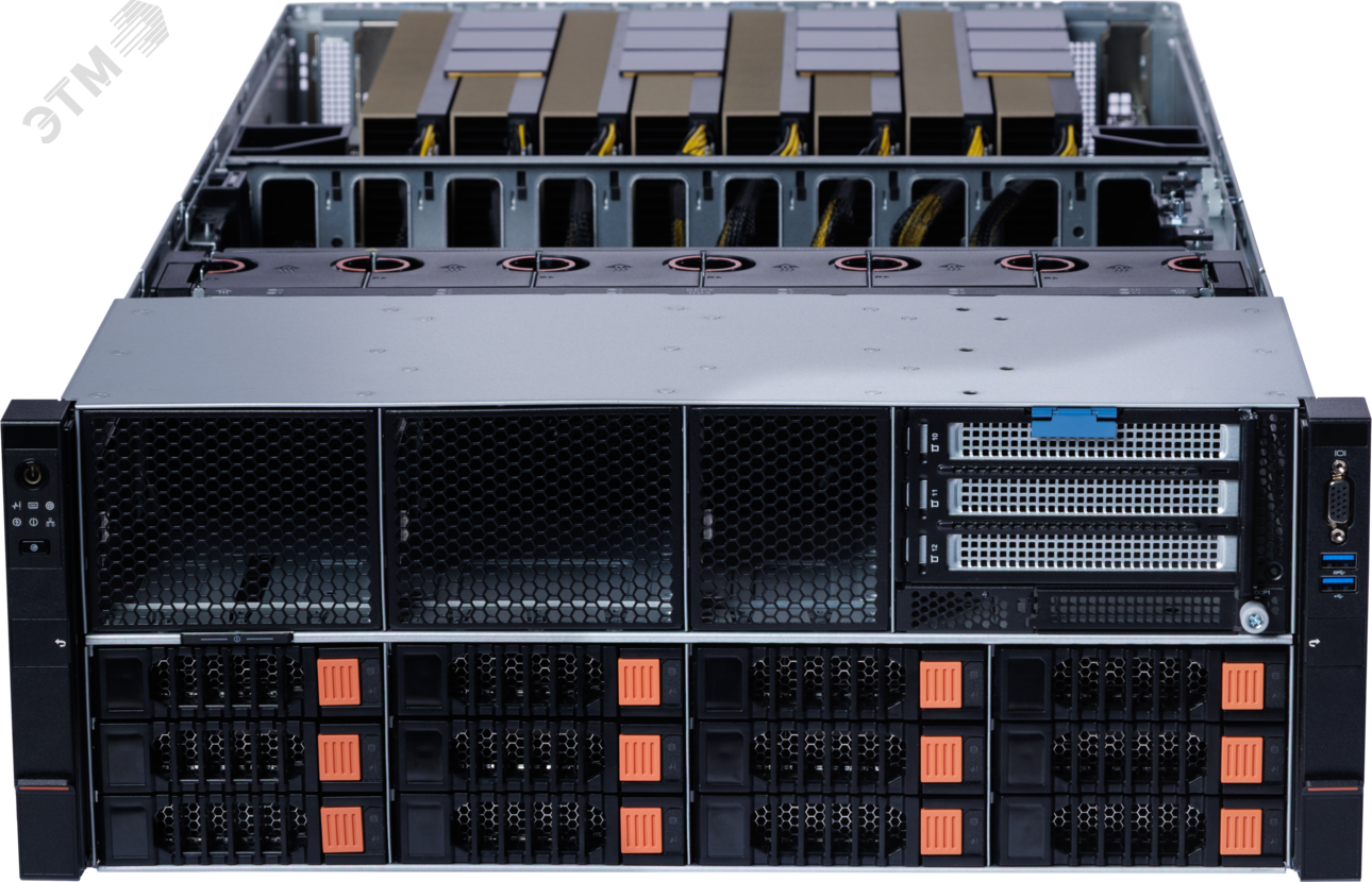 Устройство рассчитано на установку до восьми GPU PCIe 5.0 x16 двойной ширины и совместим с широким спектром профессиональных графических ускорителей NVIDIA, включая решения уровня H100, H200 NVL, L40S и RTX4090, что делает его базой как для тренинга, так и для инференса моделей различного масштаба. Использование NVLink Bridge между GPU позволяет выстраивать более плотную связность графических модулей и эффективнее распределять вычислительную нагрузку при работе с глубокими нейросетями и ресурсозатратными ИИ‑сценариями.