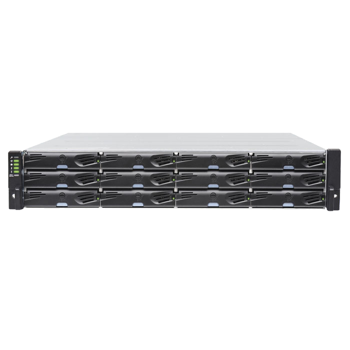 Двухконтроллерная архитектура обеспечивает полную отказоустойчивость: при выходе одного из контроллеров из строя второй продолжает работу без прерывания доступа к данным, а возможность горячей замены позволяет оперативно устранять неисправности без остановки системы. Поддержка различных типов хост-интерфейсов — Ethernet, Fibre Channel, SAS и FCoE — делает СХД универсальной для интеграции в разнообразные сетевые среды, включая как традиционные IP-сети, так и высокоскоростные SAN-инфраструктуры. Всего доступно 8 портов хост-подключения: по 4 на каждый контроллер, реализованных как 1 Гбит/с RJ-45, что обеспечивает гибкость при подключении к серверам, коммутаторам и другим узлам сети. Устройство выполнено в 2U-корпусе, совместимом со стандартной 19-дюймовой стойкой, что обеспечивает компактность и эффективное использование стойкового пространства.
